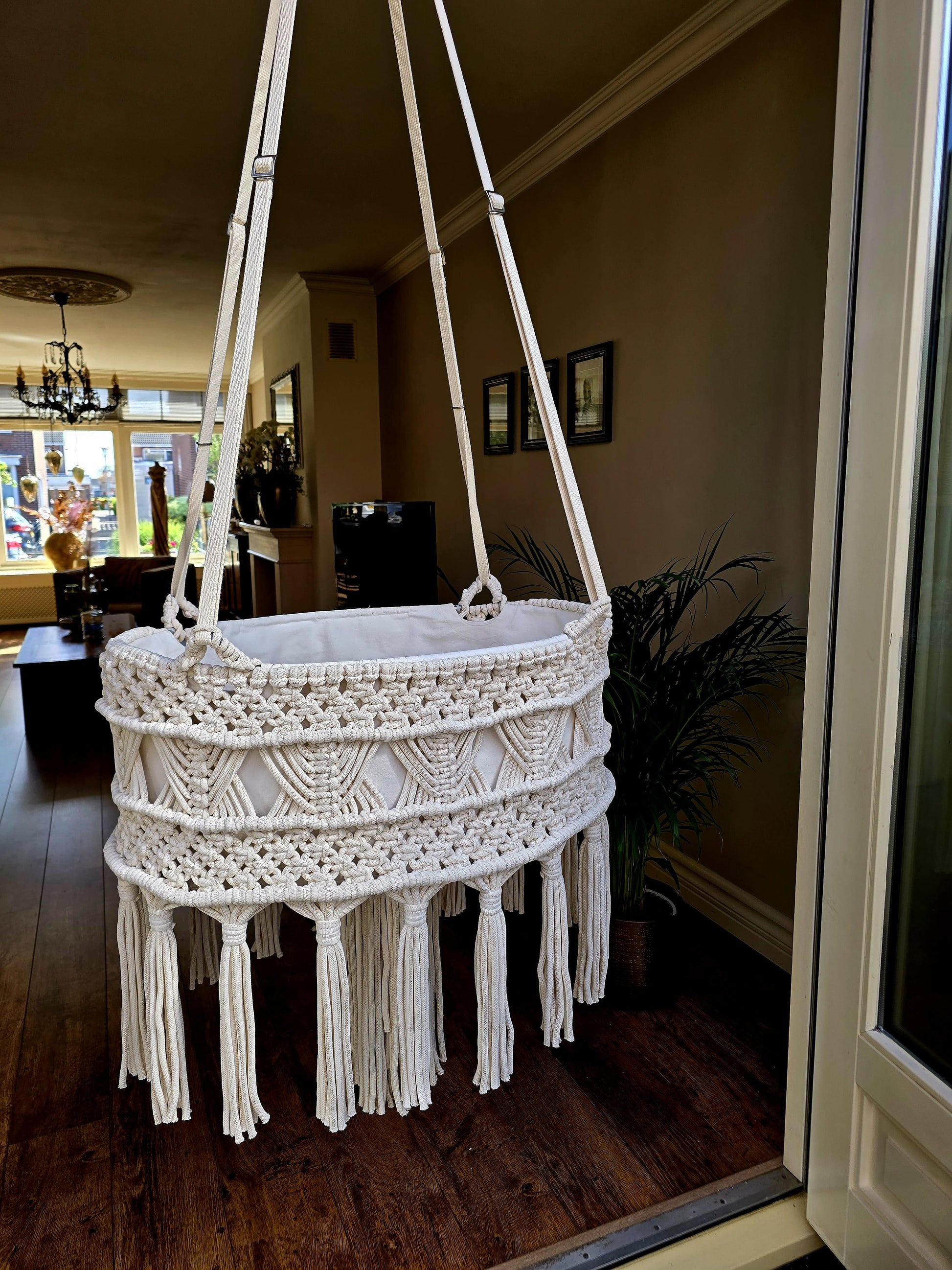 Op aanvraag kan ik deze prachtige stijlvolle wieg voor u maken, levertijd zo'n 2 weken na bestelling, de kleur zoals op de foto is creme met een fijn goud draadje erdoor 'natural golden', maak kan ook uitgevoerd worden in roze, blauw of iedere andere gewenste kleur.